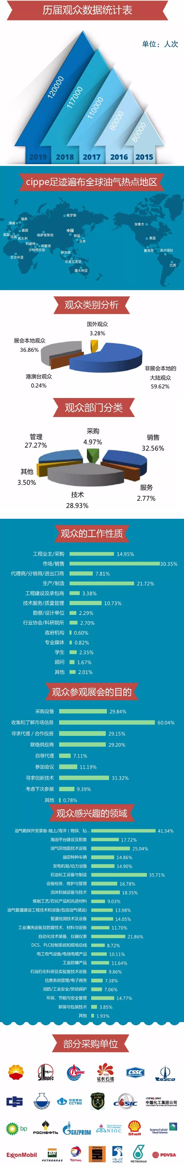 2020年,中石油、中石化、中海油總部參觀團,中石油物資公司、中石油勘探開發(fā)海外項目部、中國石油天然氣管道局、中石油海洋工程公司鉆井事業(yè)部、中石油渤海鉆探工程有限公司、中石化石油工程物資裝備部、中海油服采辦中心、中海油服油田技術(shù)事業(yè)部、大慶油田、遼河油田、勝利油田、大港油田、華北油田、延長石油、中外運長航集團、中遠船務(wù)、中船重工、中國船舶工業(yè)集團、國家能源液化天然氣技術(shù)研發(fā)中心、海隆油服、惠生工程、伊拉克石油部代表團、蒙古國礦產(chǎn)石油局、Busan Marine Equipment Association、沙特阿美、阿布扎比國家石油公司、阿布扎比國家能源公司、阿布扎比國家石油建設(shè)公司、愛沙尼亞國家能源公司、俄氣、俄油、俄管道、馬來西亞國家石油、哈薩克斯坦國家天然氣運輸公司、阿塞拜疆國家石油、日本鉆井公司、殼牌、道達爾、康菲、福陸工程、現(xiàn)代重工、德希尼布FMC、英國派特法石油工程公司、挪威船級社、三星重工、Oceaneering、Sembcorp Marine、Global Marine Services等百余個國內(nèi)外專業(yè)采購團將繼續(xù)到cippe展會現(xiàn)場參觀。