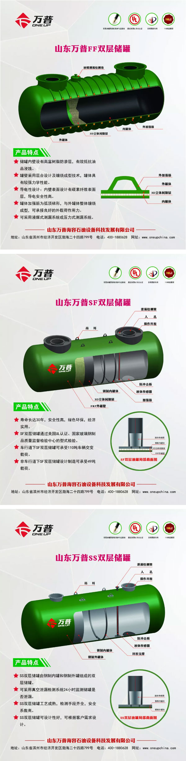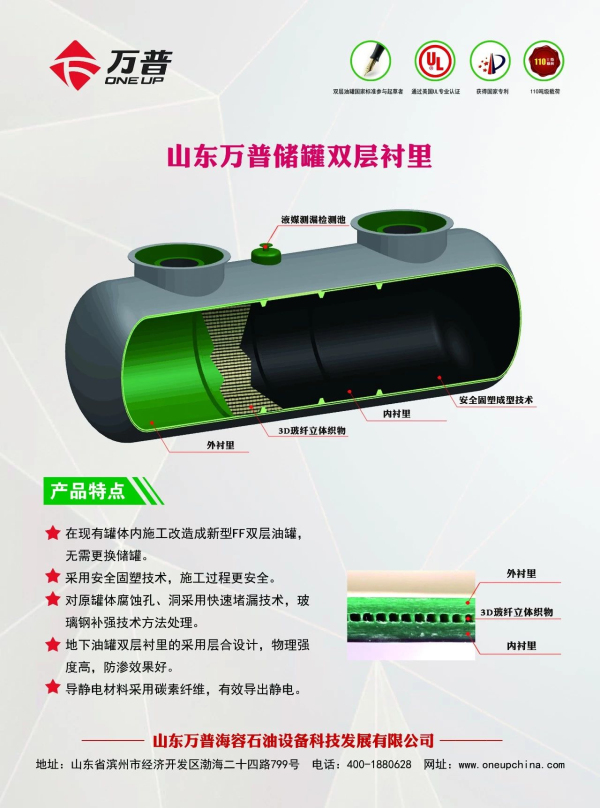 山東萬普海容石油設(shè)備科技發(fā)展有限公司(簡稱萬普公司)成立于2011年10月,是集生產(chǎn)、研發(fā)、銷售、培訓(xùn)于一體的石油化工裝備高新技術(shù)企業(yè)。萬普公司主要生產(chǎn)雙層儲(chǔ)罐,加油站埋地儲(chǔ)罐內(nèi)襯防滲改造工程,撬裝式加油裝置,D1、D2類壓力容器等產(chǎn)品,年生產(chǎn)能力6000余臺(tái)。先后通過美國UL認(rèn)證、中石化安工院檢驗(yàn)、國家玻璃鋼制品質(zhì)量監(jiān)督檢驗(yàn)中心型式試驗(yàn)。