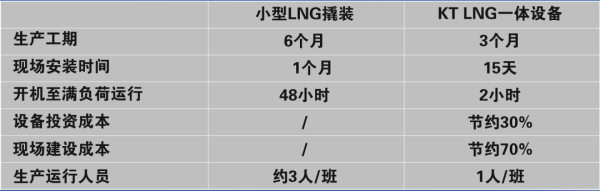 KT天然氣凈化液化一體設(shè)備與其它相同產(chǎn)量的小型LNG撬裝相比較,能顯著節(jié)約投資與運行成本: