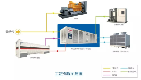 KT天然氣凈化液化一體設(shè)備將一座小型天然氣液化工廠集成為一臺緊湊的設(shè)備。它將原料氣脫酸性氣體、脫水、脫重烴等凈化處理,及天然氣液化、制冷劑壓縮流程集為一體,在一臺設(shè)備內(nèi)完成。
