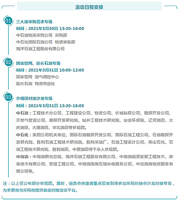 為更好的服務國內外參展商與參觀商,保障企業(yè)參展、參會實效。cippe2021將繼續(xù)在展會期間舉辦“采購對接會”活動,為參展商與采購商搭建"一對一"油氣對接交流平臺,共享行業(yè)頂級資源。歡迎參展商與采購商積極報名參與。