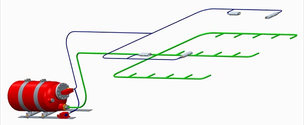 系統(tǒng)由罐體裝置 、手動觸發(fā)器 、感溫探火管路 、藥劑噴灑管路 、高壓霧化噴頭 、火源自動探測器、信號反饋裝置 及部分接頭附件組成。無火情時,系統(tǒng)完全處于零壓狀態(tài),包括藥劑罐內(nèi)滅火藥劑也以無壓液體形式存在?;鹎榘l(fā)生后,在火源自動探測器感溫原件被觸發(fā),迅速產(chǎn)生高壓氣體傳導(dǎo)至罐體并觸發(fā)產(chǎn)氣組件內(nèi)固體產(chǎn)氣劑反應(yīng)產(chǎn)生大量高壓氣體,高壓氣體推動灌內(nèi)藥劑,將其通過管路和噴頭噴灑出去,迅速湮沒受保護的空間,覆蓋、降溫并隔絕空氣,實時火情抑制,撲滅火情。
