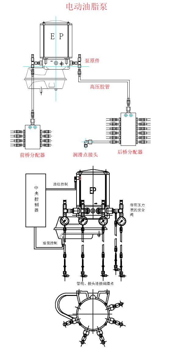 自動集中潤滑系統(tǒng)主要包括潤滑油泵、分配器、控制裝置、管線接頭等幾部分組成。電動油脂潤滑泵可以實現(xiàn)按照設(shè)定好的時間進行工作,將油脂定量定時輸送到需要潤滑的部位,分配器可以實現(xiàn)將多個潤滑點連接起來,通過管路對所有潤滑點進行依次潤滑。