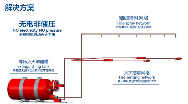 專門針對大型機械發(fā)動機等高溫區(qū)域開發(fā)的無電非儲壓式的自動滅火系統(tǒng),采用航天固體動力技術(shù),結(jié)合先進的水基滅火劑,實現(xiàn)長期穩(wěn)定運行,無壓無電,安全可靠的滅火裝置。