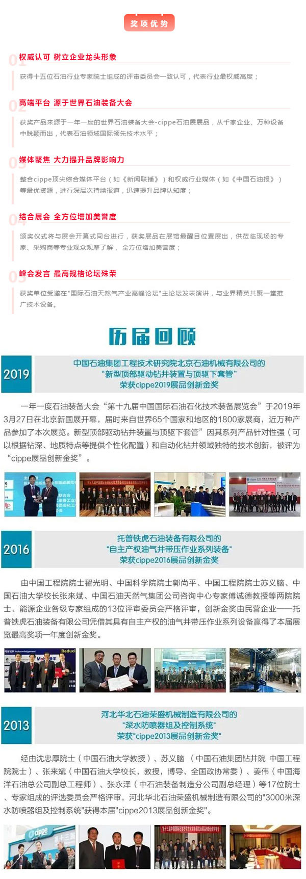 “cippe展品創(chuàng)新金獎”是cippe組委會于2012年推出的展會同期重磅活動,在業(yè)內(nèi)具有極高的影響力。cippe組委會每年都邀請至少15位院士、專家組成評選委員會,從參展企業(yè)展出的上萬件展品中嚴(yán)格評選出具有自主知識產(chǎn)權(quán)、具有重大技術(shù)突破、最能代表該領(lǐng)域國際最高科技水平的裝備及技術(shù)。“cippe 展品創(chuàng)新金獎”每年都得到千余家國內(nèi)外參展商的廣泛參與及關(guān)注,因其評選的專業(yè)性、客觀性、權(quán)威性,影響力的廣泛性,被稱為石油領(lǐng)域的“奧斯卡”。