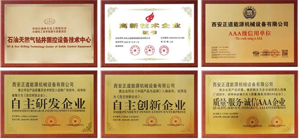 西安正道能源機(jī)械設(shè)備有限公司經(jīng)過多年的發(fā)展,在業(yè)界得到眾多權(quán)威機(jī)構(gòu)認(rèn)可,獲得了眾多殊榮,其中包括:鉆井固 控設(shè)備技術(shù)中心榮譽(yù);高新技術(shù)企業(yè)榮譽(yù);AAA級(jí)信用單位榮譽(yù);自主創(chuàng)新企業(yè);自主研發(fā)企業(yè);質(zhì)量服務(wù)誠信企業(yè)等。
