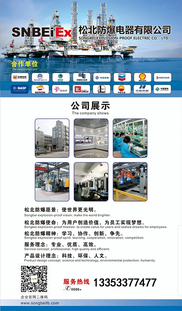 松北防爆電器有限公司是一家及研發(fā)、制造、銷(xiāo)售一條龍的專(zhuān)業(yè)性企業(yè)。公司產(chǎn)品廣泛應(yīng)用于石油、化工、天然氣、煤炭、 航空航天、船舶、海洋、軍工、消防、電力、鐵路、冶金等行業(yè),國(guó)內(nèi)暢銷(xiāo)31個(gè)省市和10多個(gè)國(guó)家和地區(qū),深受廣大用戶(hù)好評(píng)和贊美 。公司主要生產(chǎn):防爆燈、防爆配電箱、防爆操作柱、防爆控制箱、防爆磁力啟動(dòng)器、防爆開(kāi)關(guān)(斷路器)、防爆插銷(xiāo)、防爆按鈕、 防爆軟管、防爆填料函、防爆電纜盤(pán)、防爆接線盒及管件、防爆其它類(lèi)、防爆配件等100多種產(chǎn)品。