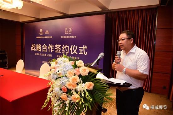 2018年7月10日下午,沈陽國際展覽中心與北京振威展覽有限公司在北京中奧馬哥孛羅酒店舉行戰(zhàn)略合作簽約儀式。沈陽國展總裁劉雨聲、振威展覽股份董事長張學(xué)山出席簽約儀式并講話,振威展覽股份常務(wù)副總裁鄧小輝主持儀式。