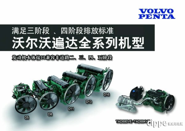 沃爾沃遍達(dá)作為沃爾沃集團(tuán)下屬的全資公司之一,是全世界少有的專業(yè)、專門、專注于非道路發(fā)動(dòng)機(jī)設(shè)計(jì),制造及銷售的公司,產(chǎn)品包括船用和工業(yè)用發(fā)動(dòng)機(jī)。 沃爾沃遍達(dá)旗下的非道路多用途發(fā)動(dòng)機(jī)共有五個(gè)平臺(tái),5升,8升,11升,13升,16升,功率覆蓋從105kW到565kW,非道路排放等級(jí)滿足歐盟二、三、四、五階段,每個(gè)排放等級(jí)的發(fā)動(dòng)機(jī)本體接口互相兼容。