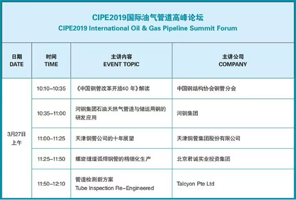 2019年3月27日首屆“CIPE國際油氣管道高峰論壇”,將在北京•中國國際展覽中心(新館)W105會(huì)議室召開。包括中國鋼結(jié)構(gòu)協(xié)會(huì)鋼管分會(huì)、天津鋼管集團(tuán)、河鋼股份有限公司、北京君誠實(shí)業(yè)投資集團(tuán)及新加坡Talcyon等國內(nèi)外領(lǐng)軍企業(yè)代表將出席本屆論壇并做主題演講。