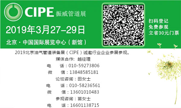 第十九屆北京國際石油天然氣管道與儲(chǔ)運(yùn)技術(shù)裝備展覽會(huì)(CIPE)將于2019年3月27日-29日在北京•中國國際展覽中心(新館)舉辦,國內(nèi)外名企匯聚,多場論壇、會(huì)議同期舉辦。