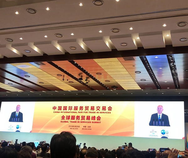 2019年5月28日-6月1日,中國國際服務貿易交易會在京盛大開幕。28日上午,全球服務貿易峰會在北京國家會議中心召開。2019年中國國際服務貿易交易會受到國家主席習近平的高度重視,專程發(fā)來賀信并指出:中國愿同各國深化服務貿易投資合作,促進貿易和投資自由化、便利化,推動經(jīng)濟全球化朝著更加開放、包容、普惠、平衡、共贏的方向發(fā)展。