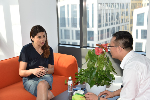 羅馬尼亞議會眾議院外交顧問Popa Diana-Melania女士(左)與振威員工交流(右)